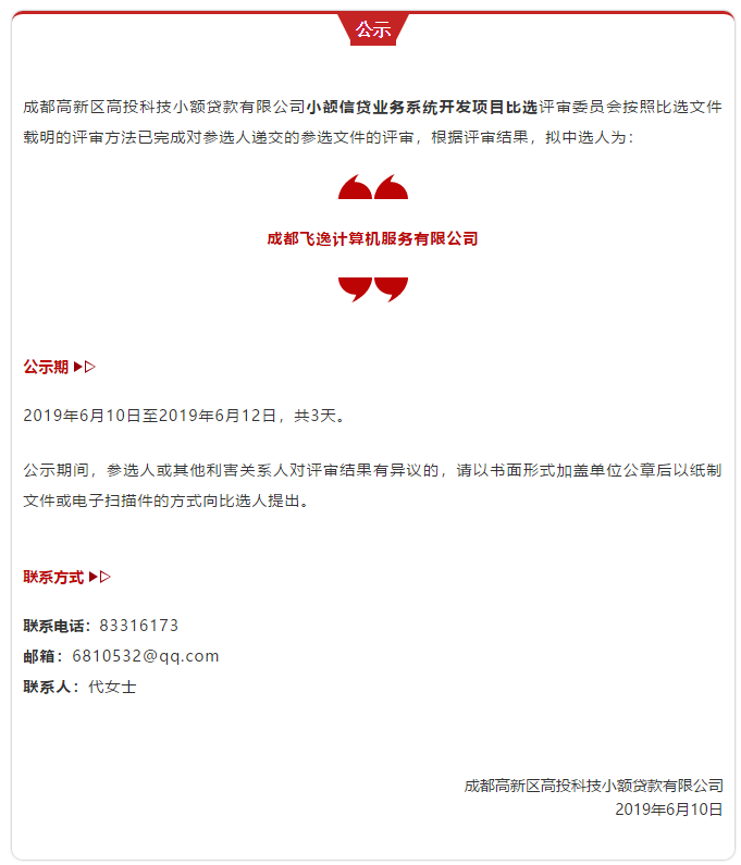 奮力拼搏創(chuàng)佳績,中標(biāo)喜訊振人心。近日,成都飛逸計(jì)算機(jī)服務(wù)有限公司在市場的跑道上疾步前行,憑借豐富的信貸軟件項(xiàng)目開發(fā)經(jīng)驗(yàn)、雄厚的技術(shù)力量以及良好的市場信譽(yù),成功中標(biāo)成都高新區(qū)高投科技小額貸款有限公司的小額信貸業(yè)務(wù)系統(tǒng)開發(fā)項(xiàng)目。
