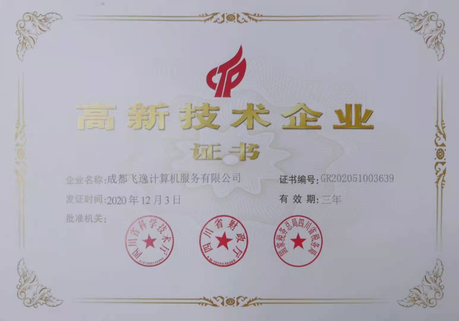 成都飛逸計(jì)算機(jī)服務(wù)有限公司,榮獲 “高新技術(shù)企業(yè)證書(shū)”資質(zhì),由四川省科學(xué)技術(shù)廳,四川省財(cái)政廳,國(guó)際稅務(wù)總局四川稅務(wù)局共同頒發(fā)授牌。