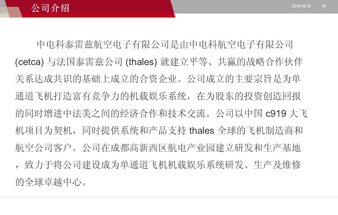 2012年3月27日, 中電科航空電子有限公司(以下簡(jiǎn)稱(chēng)CETCA)同法國(guó)泰雷茲公司(以下簡(jiǎn)稱(chēng)Thales)在德國(guó)漢堡的國(guó)際飛機(jī)內(nèi)飾展覽會(huì)上共同簽署“中電科泰雷茲航空電子有限公司合資合同”,這標(biāo)志著國(guó)產(chǎn)C919大型客機(jī)客艙娛樂(lè)系統(tǒng)的國(guó)內(nèi)外合作取得突破性進(jìn)展。