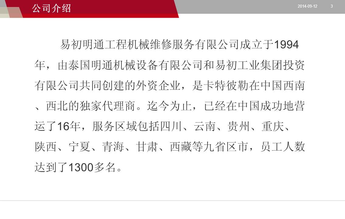易初明通工程機(jī)械維修服務(wù)有限公司 于1995年成為卡特比勒代理商,在昆明(云南?。?,成都(四川?。?,貴陽(貴州?。┖椭貞c直轄市設(shè)立了四個(gè)全資子公司。2002年,易初明通的代理區(qū)域擴(kuò)展到青海,西藏,寧夏,甘肅和陜西五個(gè)省份,位于中國(guó)西部的這些省份是政府“開發(fā)西部”經(jīng)濟(jì)發(fā)展項(xiàng)目中的重點(diǎn),并將為易初明通提供長(zhǎng)久、持續(xù)的整機(jī)、發(fā)動(dòng)機(jī)和零件銷售的發(fā)展機(jī)會(huì)。