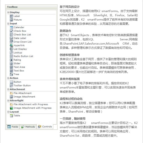 可在網(wǎng)頁(yè)上設(shè)計(jì)、搭建和使用K2 smartForms。由于支持最新HTML標(biāo)準(zhǔn),Microsoft Silverlight、IE、Firefox、Safari和Google瀏覽器,K2 smartForms提供了前所未有的快速搭建和部署普通及復(fù)雜表單的體驗(yàn),從而滿足您的方案需要。